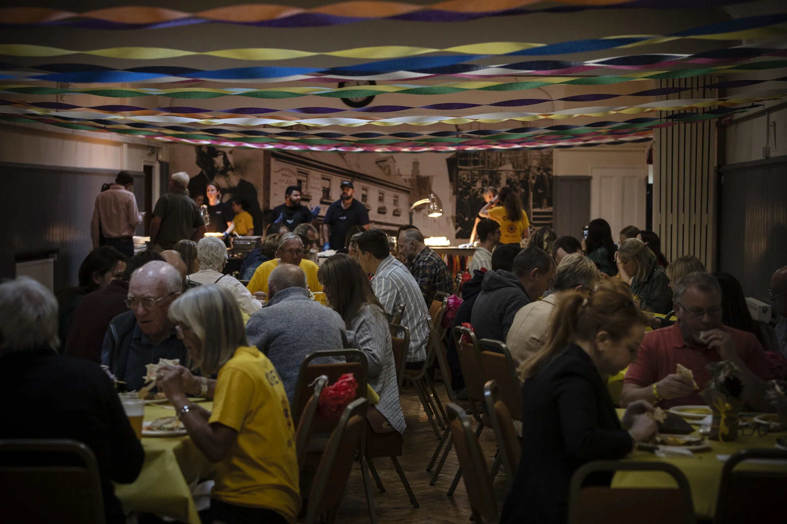 A lively indoor gathering with many people dining at tables decorated with yellow tablecloths, some wearing yellow shirts. The decor includes colorful streamers hanging from the ceiling. In the background, there are people serving food and preparing